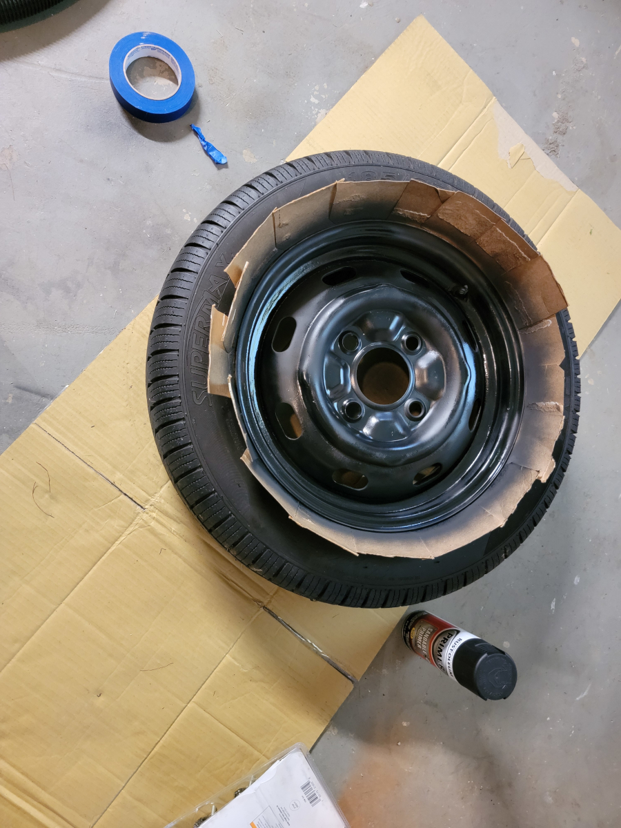 I wire brushed the first wheel, chipping off any loose paint and rust, then cleaned it with acetone. I don’t play cards, so did the next best thing and cut up a beer case into playing card sized pieces. I jammed them in the crack, separating the tire from the rim, before spraying rust treatment and primer.