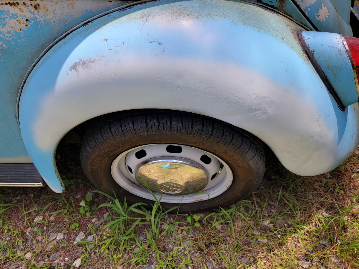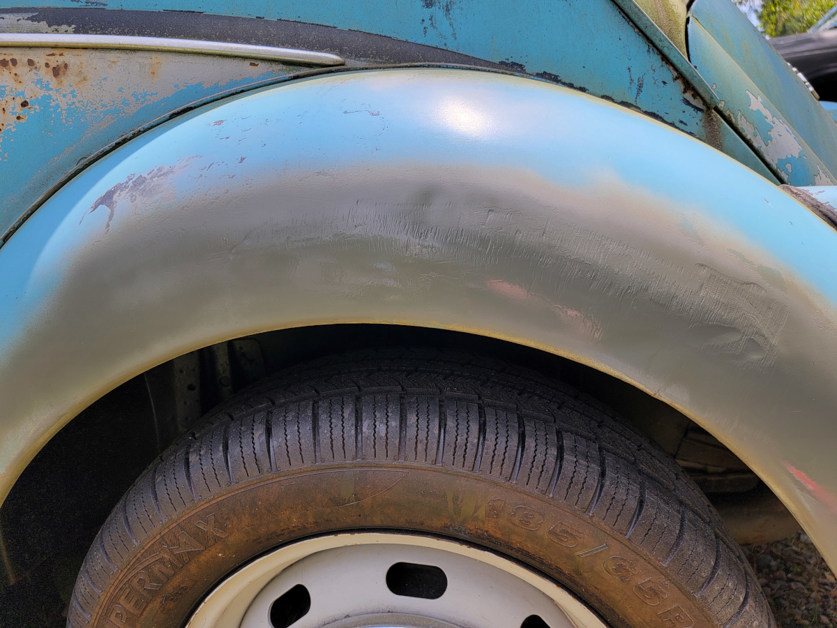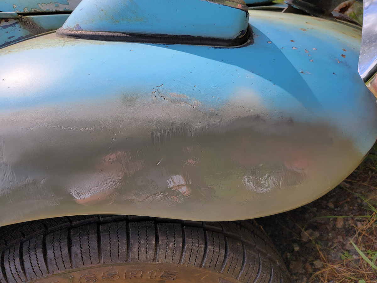 On that driver’s side fender there were old, bad repairs and it looked nasty. I sanded around the area, then rust treated, primed, and painted.