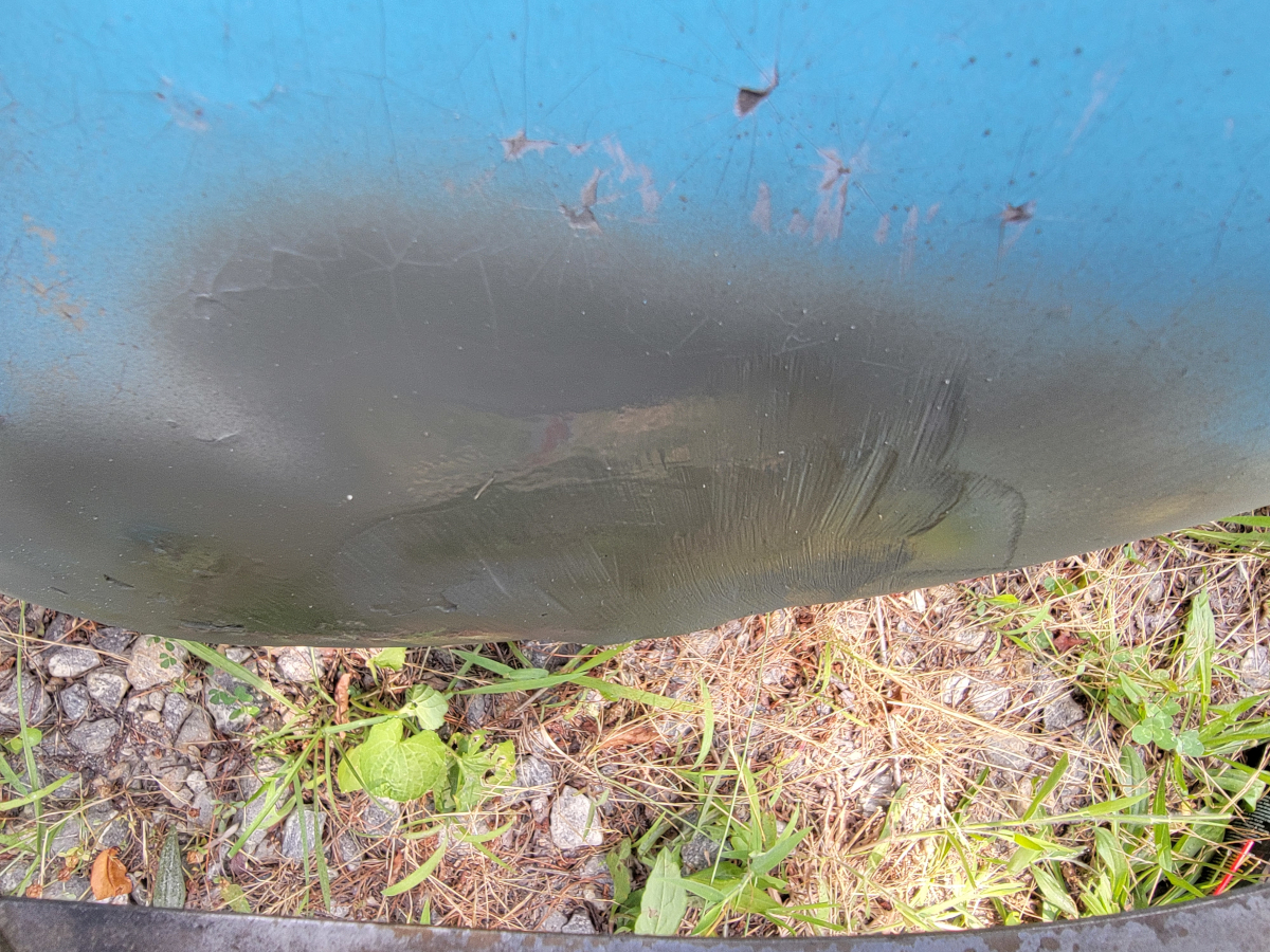 With the deck lid up in my teeth, I noticed some deep rust and bubbling paint down around the bottom. I scraped off the loose rust and then gave it a coat of rust treatment. Once that dried, I added a coat of primer, then a coat of matte vintage blue.