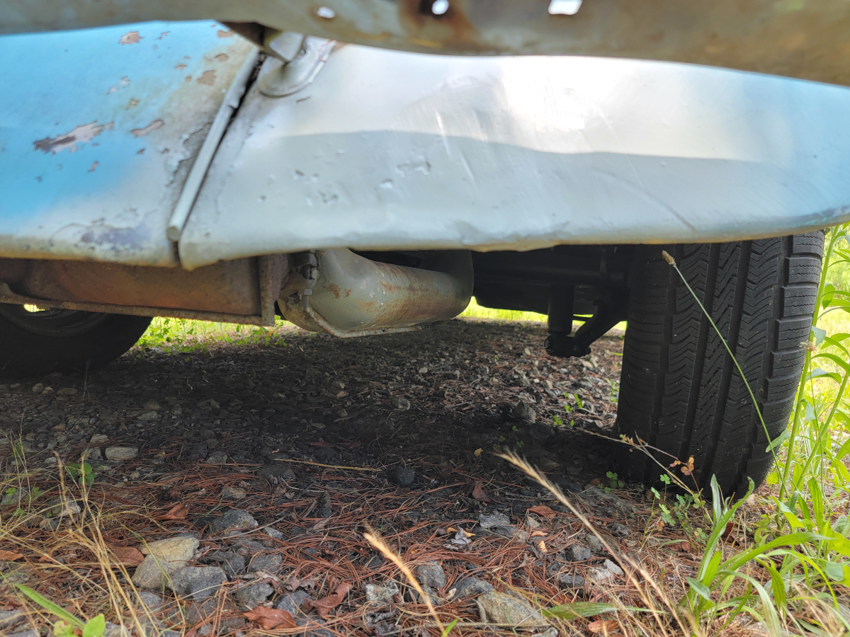 In the previous post, I found a nasty rust hole in the heater channel/frame in front of the rear fender on the passenger side. Through that hole in the side, I could also see the ground underneath, so there is more work to do under there. Today, I’m going to (not) repair the rust hole in the side.